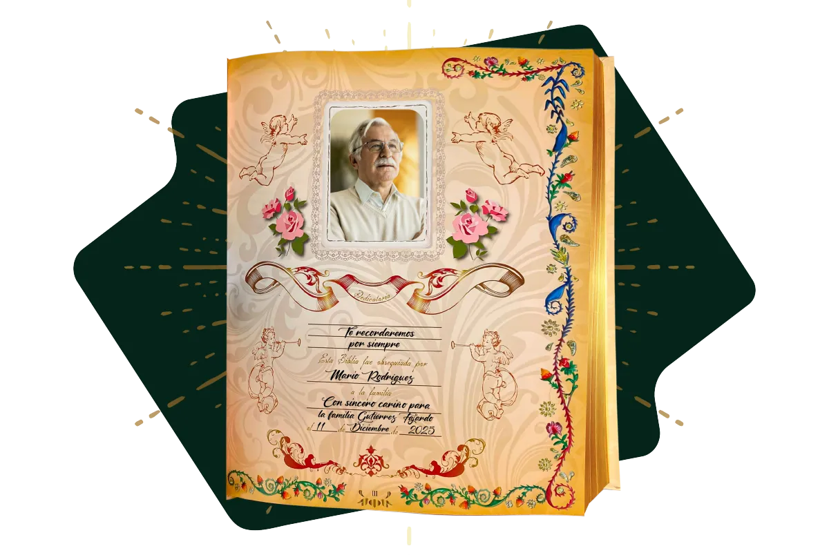 En nuestra página principal podrás dedicar esta hermosa Biblia a la memoria del ser querido que falleció, perpetuando así su recuerdo con una fotografía y un sentido mensaje como constante en los corazones de quienes lo aman.